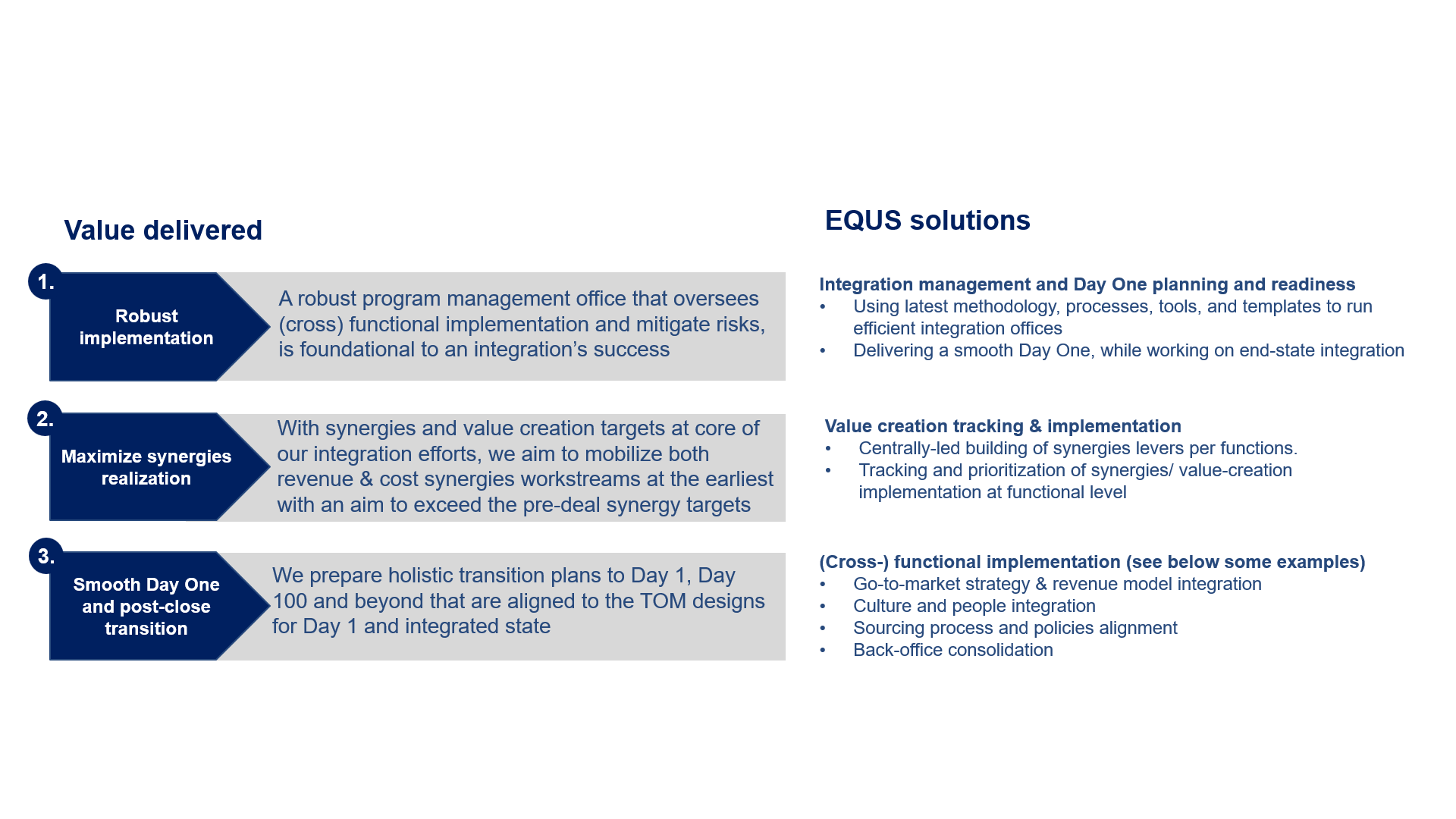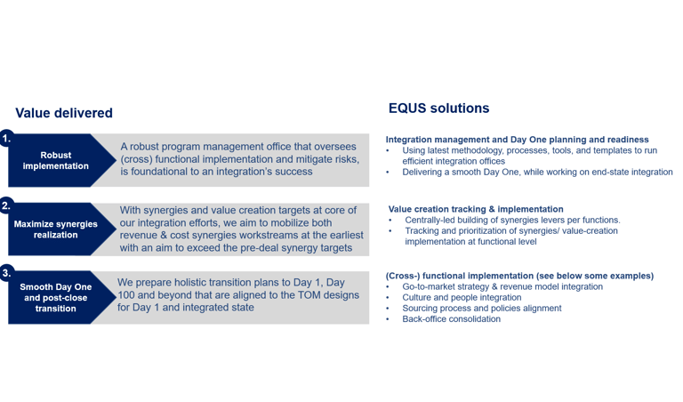 Depending on program needs, EQUS typically plays the role of engagement lead/ program director or manager/ leads the corporate office/integration management offices or leads select cross (functional) workstreams. We cover the following key aspects of an engagement.