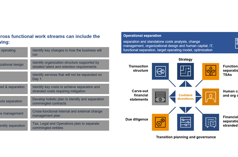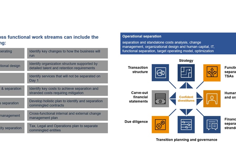 separation and standalone costs analysis, change management, organizational design and human capital, IT, functional separation, target operating model, optimization.